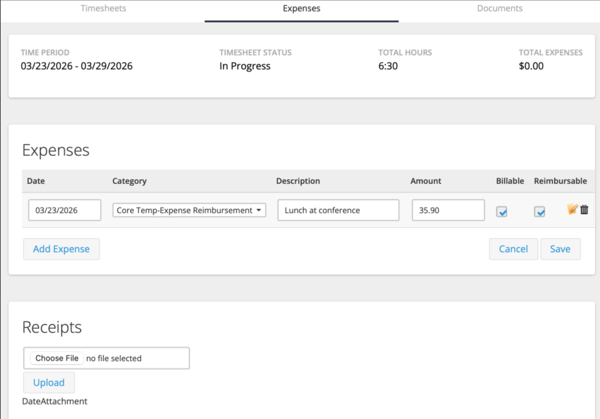 6. Next, attach a receipt in the Receipts section by clicking the Choose File button.