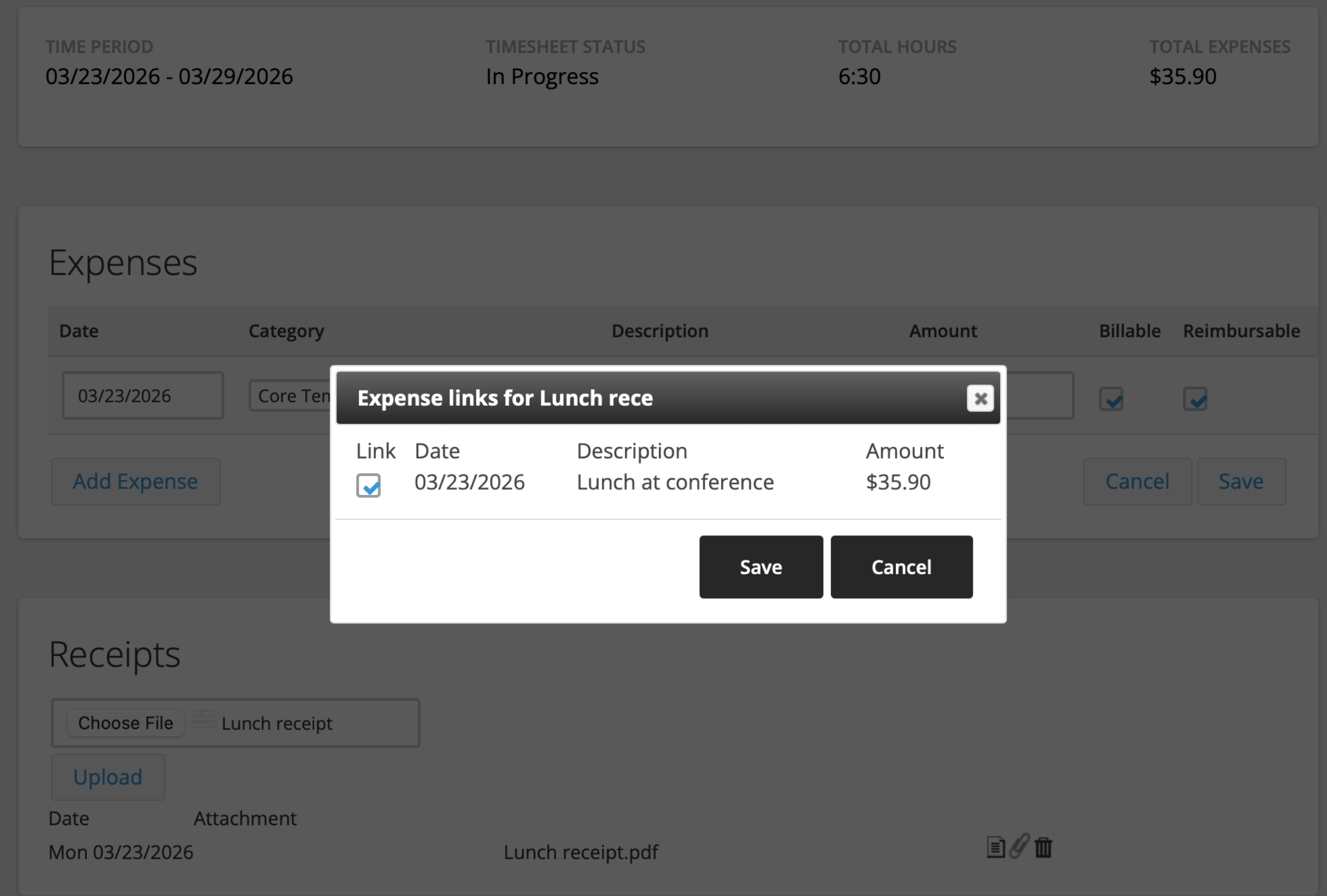 11. Select the check box to the left of the expense to link the receipt to and click Save. Once attached, the paperclip image will turn gold.